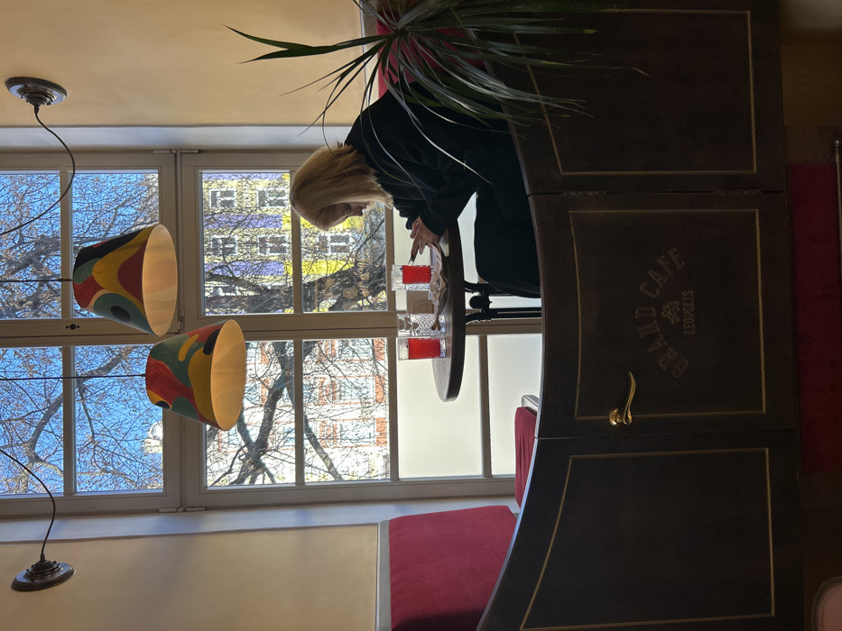 The image depicts the interior of Grand Cafe Leopolis, located at Rynok Square 1, Lviv, Ukraine. A female individual with light-colored hair, dressed in dark attire, is seated alone at a round wooden table within a dark wooden booth partition. She is observed looking down at and operating a smartphone or similar device held in her hands. On the table are two glasses containing a red liquid, one empty glass, and a napkin dispenser. To the left of the table, a red upholstered seat is visible within the booth. The dark wooden partition, embossed with "GRAND CAFE LEOPOLIS," also features a brass handle. Two pendant lamps with colorful, abstract-patterned lampshades are suspended above the table. Wall-mounted light fixtures are visible at the upper corners of the large, multi-pane window. The lower section of this window is obscured by a frosted or opaque film. Through the clear upper panes, bare tree branches and a distant, yellow-colored building with multiple windows are visible under a clear blue sky. A tall green potted plant is positioned to the right of the seated individual.