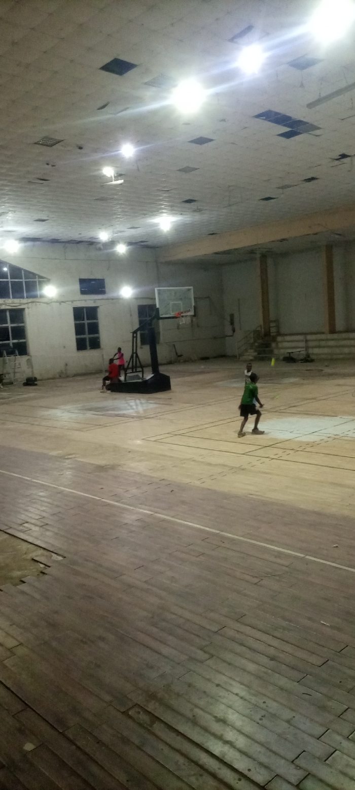A basketball court in a large gymnasium. The court has visible lines and markings for basketball. Two figures are present: one appears to be shooting, and the other is seated near a portable basketball hoop. The gym's interior shows signs of wear and is illuminated by overhead lighting fixtures. The floorboards have visible gaps and irregularities. The wall behind the hoop features windows.