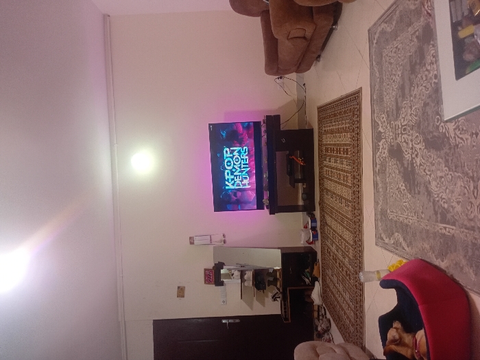The image depicts an interior view of a residential living room in the city of Unknown, Unknown. In the lower-left foreground, a small, light-brown dog is observed resting on its side within a red and blue pet bed. A clear plastic bottle is on the floor nearby. Centered in the mid-ground, a flat-screen television displays the title "K-POP DEMON HUNTERS" with prominent purplish-blue illumination. The television rests on a dark-colored entertainment stand, beneath which a device, possibly a gaming console, is visible. To the immediate right of the television, a section of a brown upholstered armchair or sofa is present. To the left of the television, against the light-colored wall, is a dark wooden shelving unit containing multiple pairs of shoes and other miscellaneous items. A dark brown door with a silver handle is partially visible on the far left. The floor is covered with light-colored tiles, over which two distinct patterned rugs are laid: a larger rectangular rug with brown and beige patterns in the mid-ground, and a smaller grey and white patterned rug in the foreground. The room is illuminated by overhead artificial light sources, creating lens flares in the upper portion of the frame. No human subjects are visible.