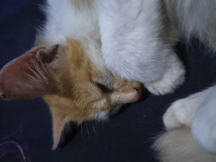 A sleeping cat with its head turned sideways rests on a dark surface. The cat is primarily white with patches of orange fur around its face and ears. One of its paws is positioned over its eyes, as if shielding them from light. The cat's pink nose and whiskers are visible. Its fur appears soft and fluffy, and the overall image conveys a sense of peacefulness and comfort.