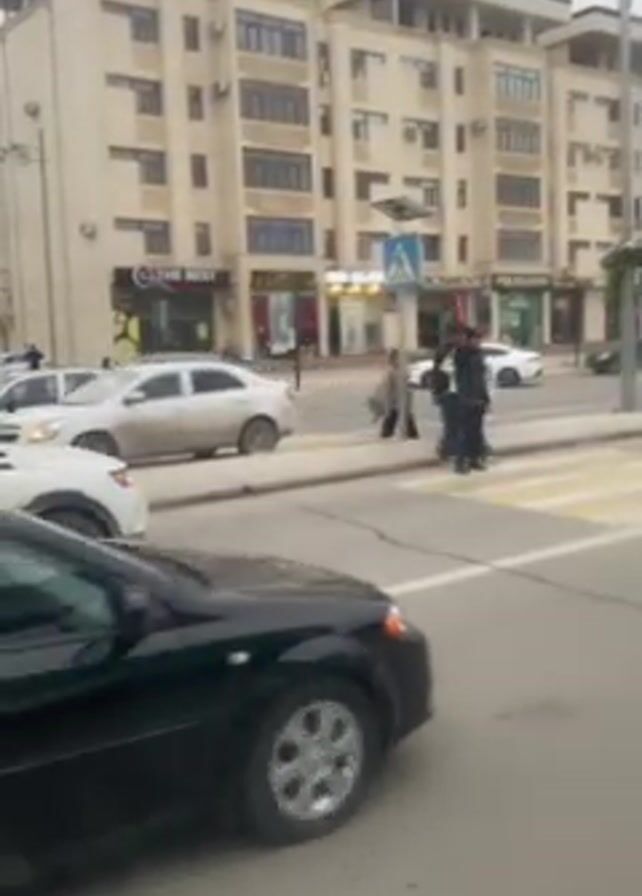 street scene. Several people are standing on a crosswalk. Cars are parked along the side of the road, and other cars are driving in the street. There is a multi-story building in the background with shops on the ground floor. The weather appears to be overcast.