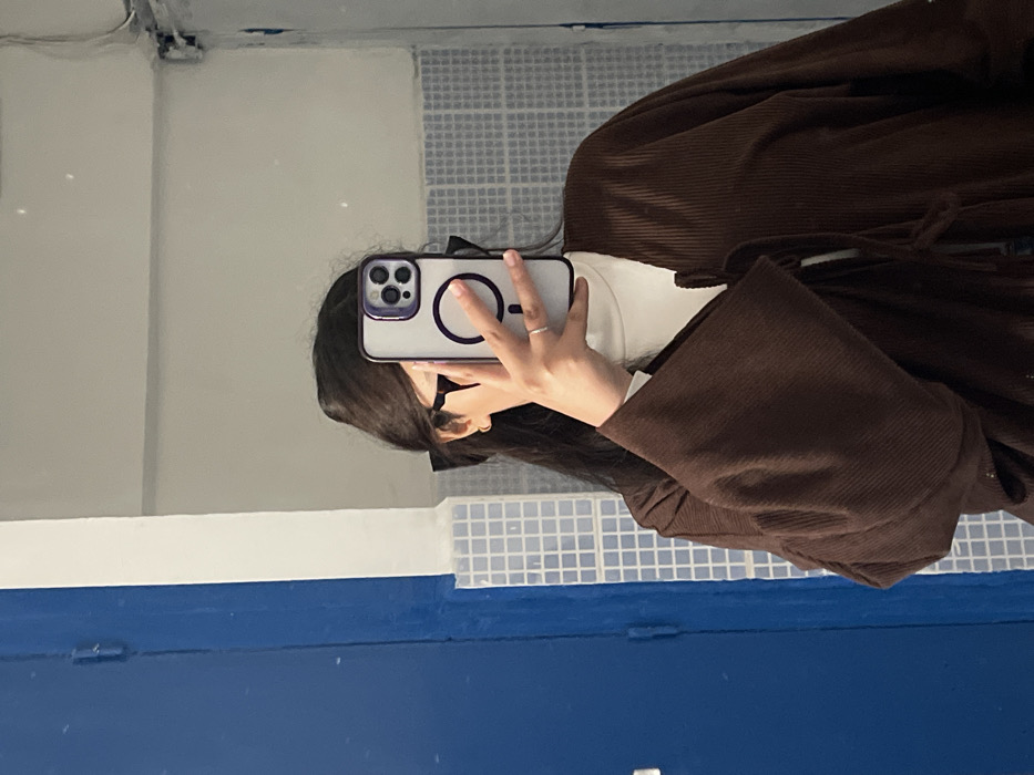 A person with long, dark hair, wearing dark-framed eyeglasses and a gold-colored hoop earring in the visible ear, is depicted taking a mirror selfie with their right hand. Their face is obscured by the smartphone. The individual wears a white turtleneck shirt beneath a brown, wide-sleeved jacket or cardigan made of a textured, possibly corduroy, fabric with visible front ties. A silver-colored ring is present on the ring finger of the right hand. The smartphone is an iPhone model housed in a clear protective case, featuring a visible MagSafe ring and a distinct purple bezel around the camera module. The background, reflected in the mirror, shows an interior space within the city of Fez, Morocco. This environment features a wall section tiled with small, light blue and white square mosaics. To the left, a large, prominent blue surface, possibly a door, is visible next to a vertical white structural element. The upper wall sections are light-colored.