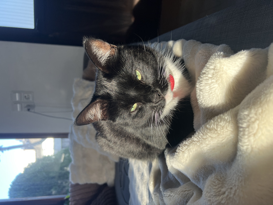 - "In an indoor setting within Beverwijk, Netherlands, a black and white bicolored cat is observed resting on a cream-colored, plush blanket" by FM-XA2Is1, licensed under CC BY 4.0