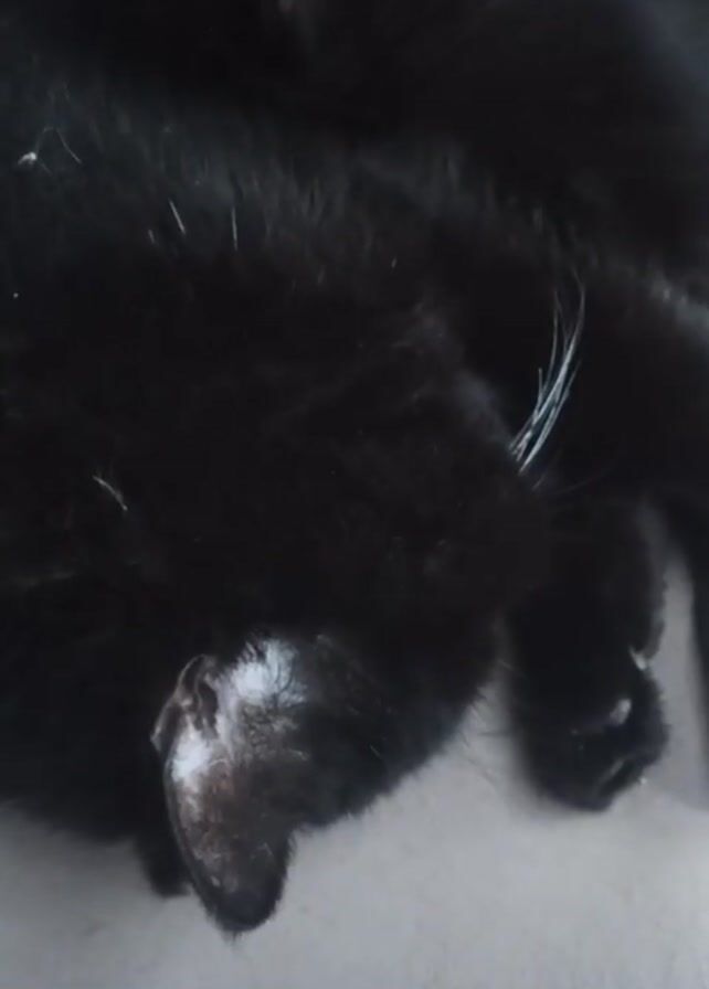 black cat lying on a light-colored surface. The cat's head is visible, with a portion of its ear showing a white patch. The cat's fur appears soft and fluffy. Some of its claws are visible, showing that it is relaxed. A soft meow can be heard in the background. The lighting appears to be from an indoor source.