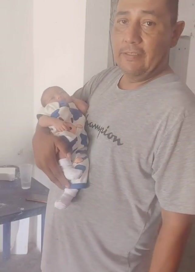 A man with tan skin, a gray shirt with the word "champion" printed on it, and short, dark hair stands inside a room. He holds a newborn baby in his left arm. The baby is wearing a white and blue patterned onesie and white socks. A small blue table is visible to the left of the man, with a clear plastic cup, a small white block, and what appears to be a cell phone on it. The background consists of plain white walls. The man looks at the camera, then turns to look at the baby, before returning his gaze to the camera and smiling.