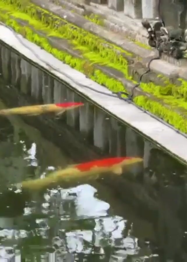 two koi fish swimming in a long, narrow pond. The fish are a light yellow color with red markings on their heads and backs. The pond is surrounded by a stone border covered in green moss. The water in the pond is clear, and the fish are visible swimming near the surface. The camera angle is static, and there are no visible people in the frame.