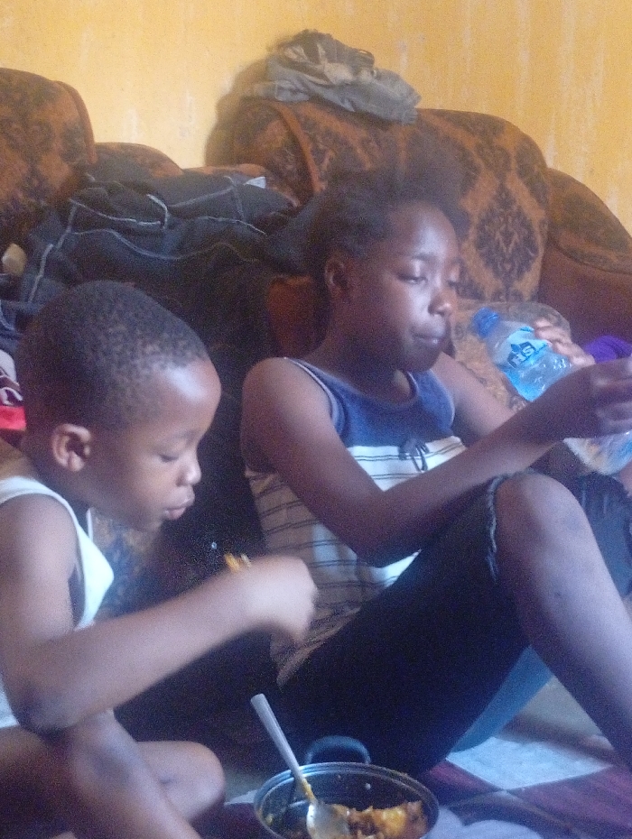Two individuals, a young male and a female, are seated on a patterned floor mat in an indoor setting. A yellow-orange wall serves as the background, partially obscured by upholstered furniture draped with dark fabric. The male, positioned on the left, has short dark hair and wears a white sleeveless top; he is actively eating food with his right hand from a shared metal pot. The female, seated on the right, wears a blue and white striped sleeveless top and dark trousers; she holds a clear plastic water bottle with a blue "IRIS" label in her left hand. A metal spoon rests within the pot, which contains a mixed food item. The scene is located in a room in Unknown, Unknown.