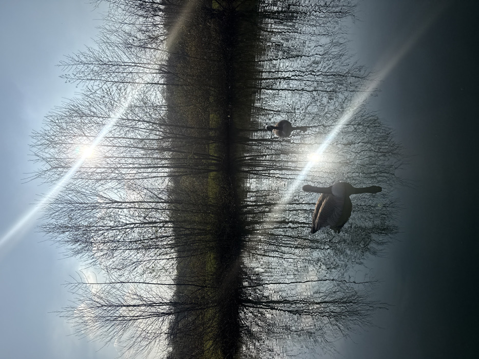 This image captures an outdoor scene in Mouscron, Belgium, under bright daylight. The foreground and midground are dominated by a body of water, possibly a pond or canal, which displays rippled surface texture and clear reflections of the sky and trees. Two geese are present on the water. The primary goose is positioned in the lower-left quadrant, oriented with its head slightly raised and facing towards the right, its reflection visible beneath it. A second goose is located further back on the right side of the water. The background features a dense line of deciduous trees and shrubs, largely bare of leaves, bordering the far bank of the water. A strip of green ground is visible beyond these trees. The sun is positioned in the upper right, emitting a strong diagonal lens flare that traverses the scene, extending across the water and over the foreground goose. The sky above is a light blue with minimal cloud cover.