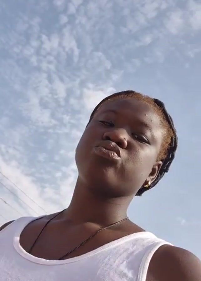A woman is looking up at the sky. She is wearing a white tank top and a necklace. Her hair is styled in dreadlocks, with some strands dyed blonde. She has a nose ring and gold earrings. The sky is blue with scattered clouds. The camera is held at a low angle, looking up at her.