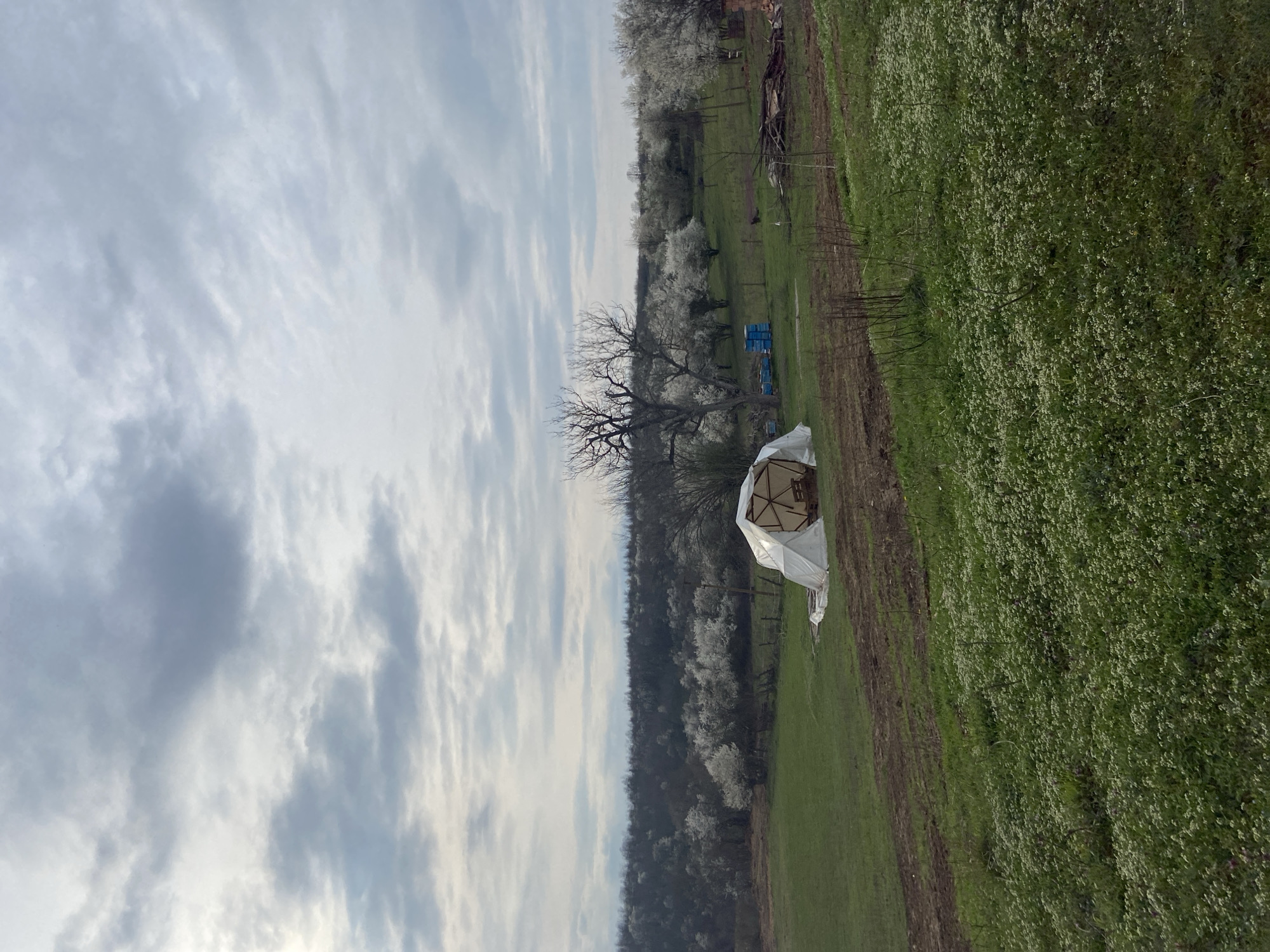 rural landscape in Mindia, Bulgaria. The scene is dominated by a field with a strip of tilled soil running alongside it. The field is lush and green, covered in small white flowers. A white, dome-shaped structure covered in plastic sheeting sits on the edge of the field. Beyond the field, a row of trees stretches across the horizon, many in full bloom with white blossoms. Further back, several blue-colored objects appear to be located near the tree line. The sky is overcast with thin, wispy clouds. A large, leafless tree is visible near the white structure.