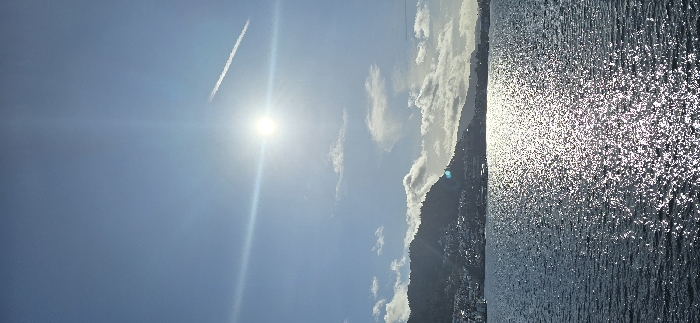 The image displays a sunlit landscape scene over a body of water in Bergen, Norway. The upper half features a bright blue sky with a prominent, radiant sun in the upper-middle quadrant, producing strong lens flare. Scattered white cumulus clouds are visible, predominantly in the lower right portion of the sky, along with a distinct white contrail from an aircraft extending diagonally in the upper right. The lower half of the scene consists of a large expanse of water, likely a fjord or bay, which intensely reflects the sunlight, creating a wide, shimmering path from the horizon to the foreground. Across the water, a dark, tree-covered mountainous landmass rises, its lower slopes densely populated with numerous light-colored buildings characteristic of a hillside city. No individuals, specific actions, or interactions are discernible within the frame.