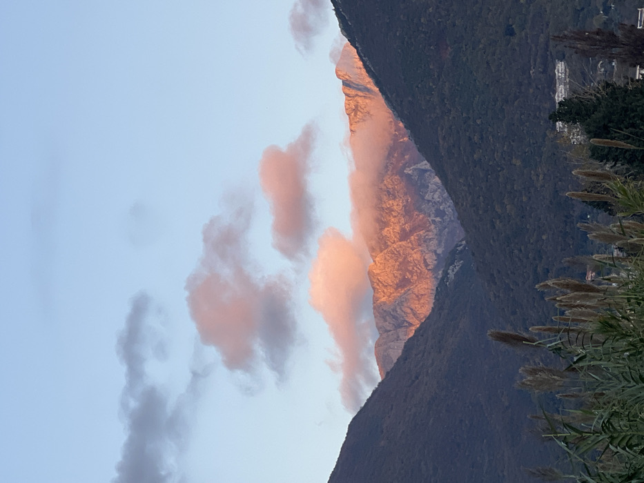 The image displays a mountain landscape located in Bar, Montenegro, during either sunrise or sunset. The upper portion reveals a pale blue sky with scattered clouds; some are dark grey, while others closer to the horizon exhibit prominent pink and orange illumination. The central, distant mountain peaks are rugged and rocky, bathed in a strong orange-red light, partially obscured by these pink-hued clouds. The mountains flanking the central peaks, located closer to the viewer, are densely covered with dark green vegetation and appear in shadow. The immediate foreground contains a cluster of tall, reedy plants with light brown plumes. Below these plants and nestled on the lower mountain slopes to the right, segments of light-colored multi-story buildings and dark evergreen trees are partially visible. No individuals or specific actions are depicted within the scene.