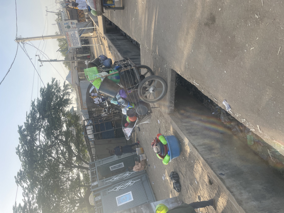 An image showing a street scene with a cart overloaded with buckets and containers. The cart is parked near a narrow canal or drain. People and a building are visible in the background, along with a sign post. The photo seems to be taken at an angle, the light creates a rainbow in the water.
