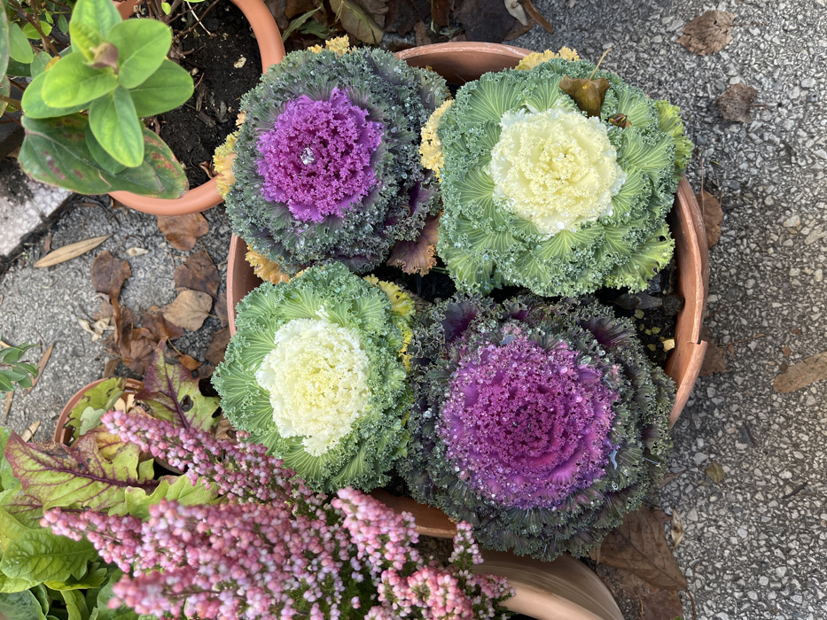 The image displays an outdoor arrangement of potted plants, situated on a light gray concrete surface, likely in the City of Zagreb, Croatia. The central focus is a large, round, reddish-brown terracotta pot containing four ornamental cabbage (Brassica oleracea) plants. Two of these plants feature bright yellow-green centers with surrounding ruffled green leaves, while the other two exhibit vivid magenta-purple centers with dark green-purple ruffled outer leaves. Numerous small water droplets are visible on the leaves of all four cabbage plants. To the upper left, partially obscured, is another terracotta pot holding a plant with abundant small pink-magenta flowers, resembling heather. A third terracotta pot, positioned to the upper right, contains a plant with broad green leaves. The concrete surface beneath and around the pots is sparsely covered with scattered, dried brown autumn leaves. A visible crack is present on the rim of the large terracotta pot. No people or animals are present in the scene.