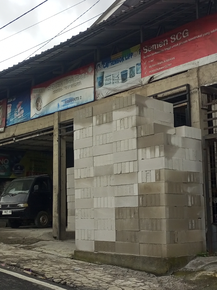 A building supply store has several banners advertising construction materials. Banners read "SEMEN TIGA RODA," "CAT TEMBOK LIPPOT," and "Semen SCG." A pile of white rectangular blocks, likely aerated concrete blocks, sits near the entrance. A black van is parked under the awning of the building. The street in front of the store is paved.