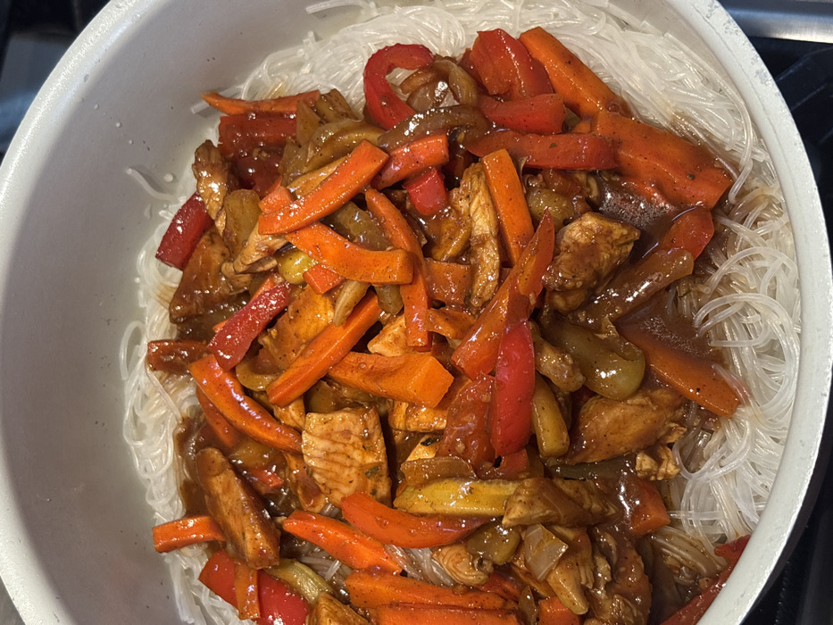 A close-up, overhead view depicts a prepared meal served within a light-colored cooking pot. The dish features a stir-fried mixture of irregular chicken pieces, numerous bright orange carrot slices, and red and yellowish bell pepper strips, all coated in a glossy, dark brown sauce. This mixture rests upon a base of translucent, thin noodles, consistent with rice vermicelli or glass noodles. The food fills the majority of the pot's visible interior. The scene is located in Перовское сельское поселение, Ukraine.