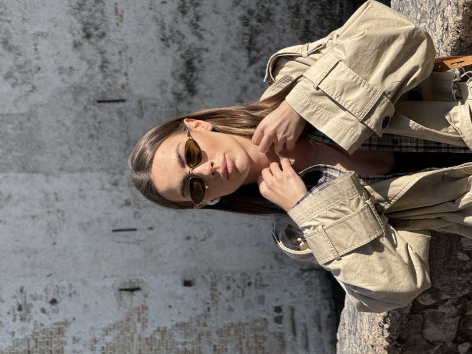 A single female subject is depicted in a medium shot, positioned outdoors against an aged stone wall, specifically located in Sirmione, Italy. The woman has long, straight brown hair with lighter highlights, parted centrally. She wears narrow, dark-lensed sunglasses with thin metallic frames and a white wireless earbud in her left ear. Her attire consists of a light-colored, possibly khaki or beige, trench coat worn open, revealing a blue and brown plaid shirt over a dark undershirt. Her hands are raised, with fingers resting on the collar area of her trench coat. She maintains a direct gaze towards the viewer. The background features a textured, light-grey stone wall constructed from irregularly shaped blocks, indicative of historical masonry. A rough-hewn stone ledge or parapet is visible in the lower foreground. Strong natural sunlight illuminates the scene from the left, casting subtle shadows.