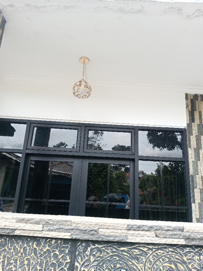 The image depicts the exterior of a building in Vieng Phouka, Laos, viewed from a slightly upward angle. A white ceiling occupies the upper portion, featuring a single gold-colored, ornate pendant light fixture with a spherical, openwork design. Minor discoloration is visible on the upper left section of the ceiling. Below the ceiling is a large, dark-framed window assembly comprising multiple rectangular panes. The window glass is reflective, displaying distorted reflections of the external environment. Visible reflections include green foliage from trees, portions of a residential roof with terracotta-colored tiles, and a light blue vehicle. Partial reflections of at least two individuals are discernible in the lower window panes: one person on the left appears to be holding a dark umbrella or wearing a dark head covering, while another individual's face is partially reflected further to the right. Beneath the window is a decorative wall structure. The upper section consists of horizontally stacked, light-colored stone tiles with varying shades of beige and grey. The lower section of the wall features a dark base with raised, intricate, light-colored patterns or abstract relief ornamentation. To the far right, a vertical pillar or wall section is clad in vertically oriented, light-colored stone tiles.