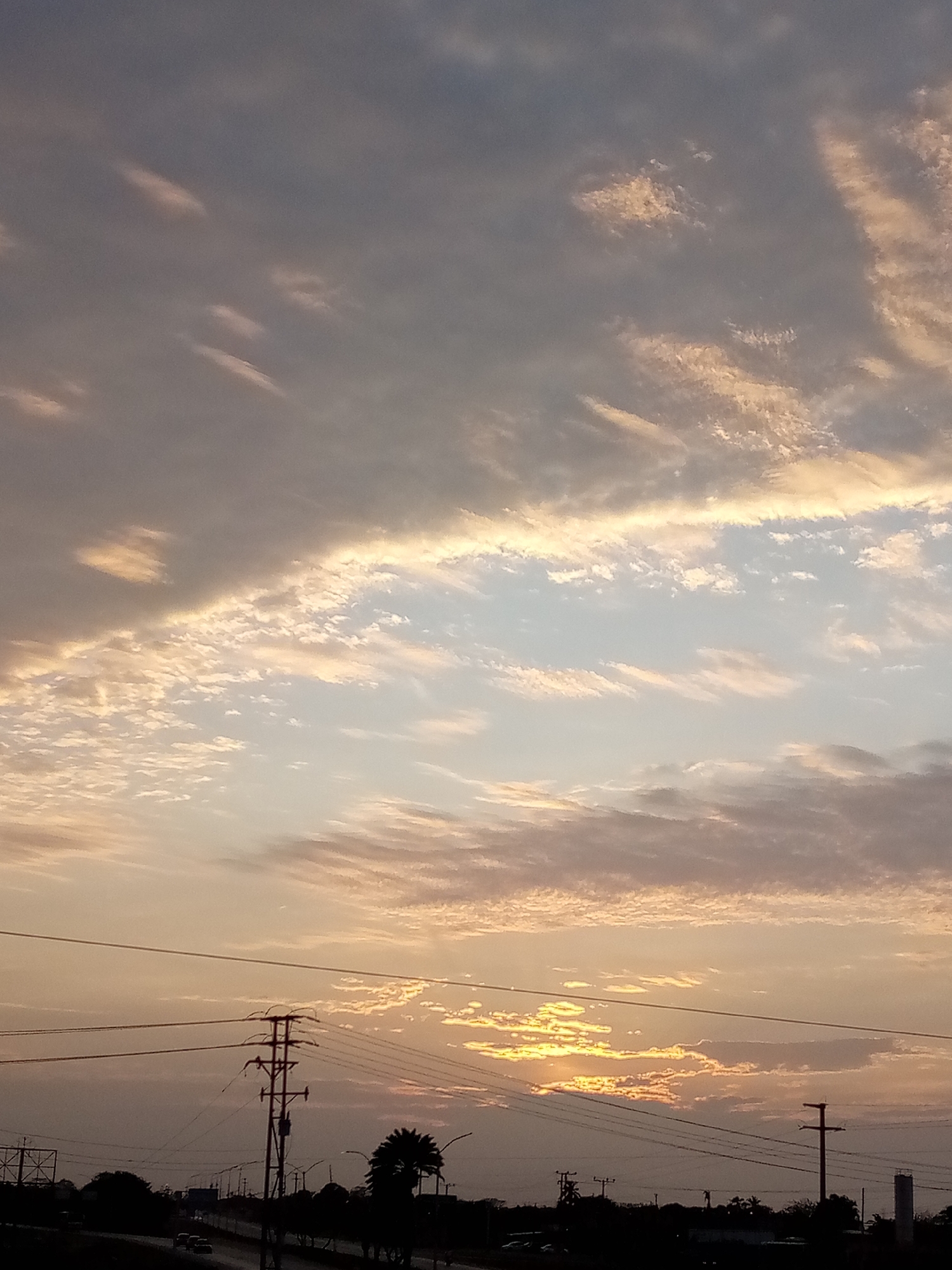 The image depicts a sky at sunset over what appears to be a highway. The sky has layers of clouds, ranging from darker, gray-toned clouds at the top to orange and yellow-tinged clouds near the horizon where the sun is setting. Below the sky, there is a road with vegetation and infrastructure, including electrical poles and lines, and silhouettes of trees. A few vehicles can be seen on the road. The information provided states that this scene is in El Dátil, Venezuela, but this can't be confirmed from the visual data.