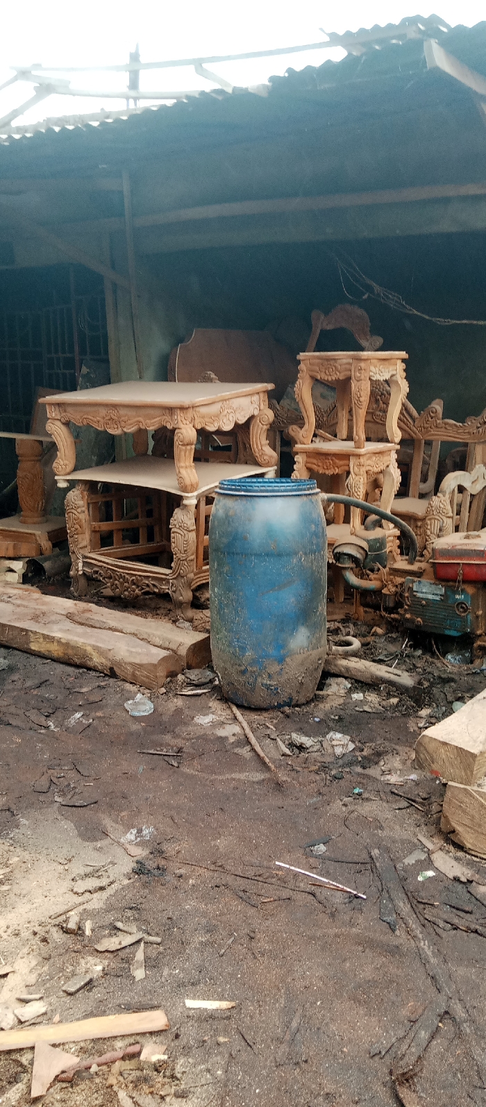 This image depicts an outdoor or semi-enclosed woodworking workshop or storage area located in Fegge, Nigeria