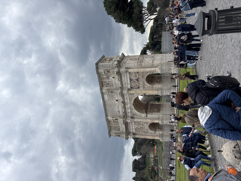 The image depicts the Arch of Constantine, located in Rome, Italy, between the Colosseum and the Palatine Hill
