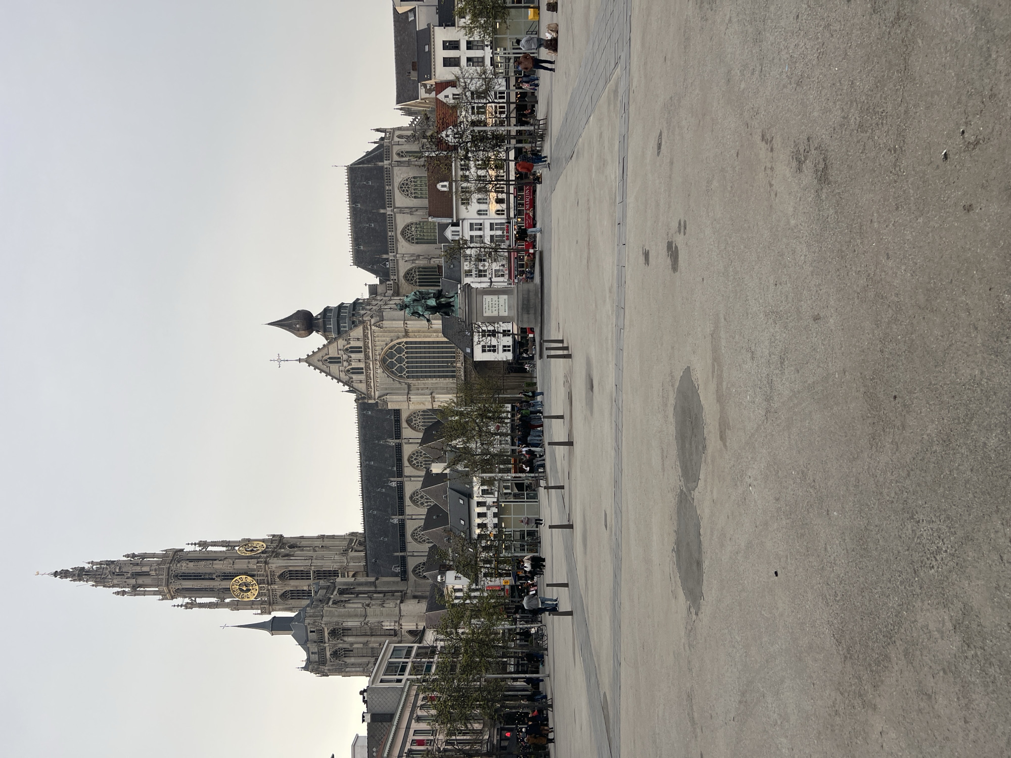 This image depicts the Groenplaats in Antwerp, Belgium, under an overcast sky