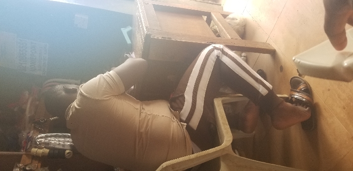A person is seated facing a wooden counter or desk within an indoor commercial establishment. The individual, observed from behind and slightly to the left, is wearing a light beige short-sleeved top and dark trousers with two parallel white stripes running down the outer seam of each leg. They are barefoot, with brown and black slide sandals resting on the light-colored tiled floor near their feet. The person occupies a light-colored plastic chair. On the wall behind them, a sign is partially visible, displaying "MONIEPOINT" and a phone number, "081085551," indicating a financial service or agency. Various small items and what appear to be metallic objects hang or are placed on shelves in the background. On the wooden counter in front of the seated individual, a small electronic device is present. A hand holding a light-colored object, possibly a smartphone, is visible in the lower right foreground. The scene is illuminated by strong natural light entering from the right side of the frame, creating a bright glare. The location is an unidentified commercial interior in Unknown, Unknown.