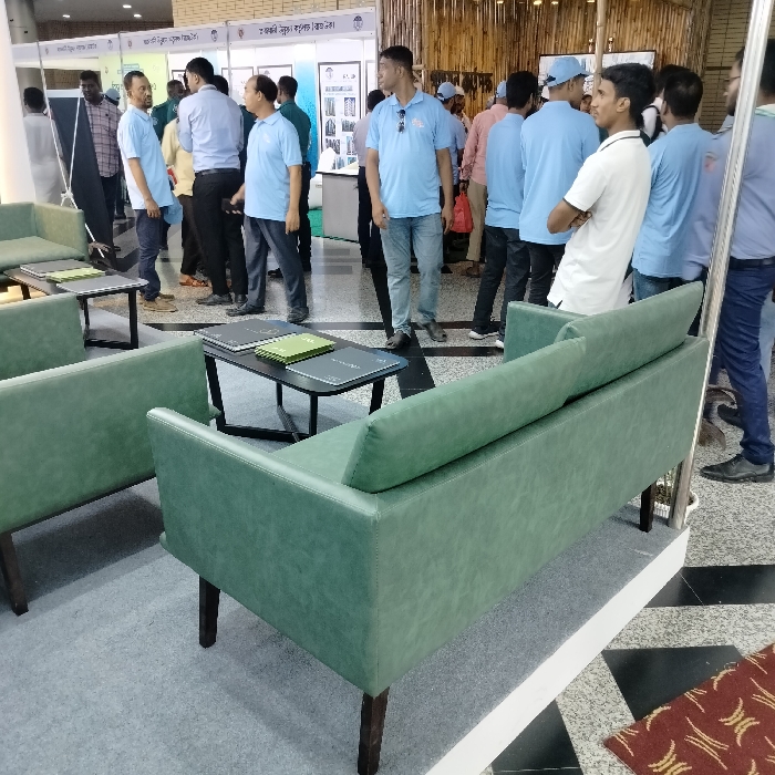 This image depicts an indoor scene at a Housing Fair (আবাসন মেলা) in Dhaka, Bangladesh, likely held at a major convention center. The event is associated with the Ministry of Housing and Public Works (গৃহায়ণ ও গণপূর্ত মন্ত্রণালয়), as indicated by banners in the background. In the foreground, two contemporary-style seating areas are arranged. On the left, two light green armchairs flank a small, black rectangular coffee table. On this table, two dark notebooks or brochures are visible. On the right, a light green two-seater sofa, matching the armchairs, faces away from the viewer and is positioned on a raised grey platform. Another similar black coffee table with one green and one dark grey/black brochure rests in front of this sofa. A partial view of a patterned reddish-brown rug is visible on the far right. The midground and background are populated by approximately 20-30 adult males. Many individuals are wearing light blue polo shirts, some with an indiscernible logo, suggesting a uniformed group or staff. Others wear business casual attire, such as a light blue dress shirt and dark trousers, or casual wear like a white polo shirt and jeans. People are standing in small clusters, conversing, and observing the exhibition booths. One man in a white polo shirt with crossed arms is visible on the right side of the midground. Another man in a light blue polo shirt and jeans, with sunglasses hanging from his collar, stands near a black table. The background features multiple exhibition booths framed with white modular structures. Banners with Bengali text are visible, explicitly stating "Housing Fair" and referencing the Ministry of Housing and Public Works. A decorative wall composed of vertical bamboo-like slats is present on the right side of the background. The flooring consists of grey carpet in the seating areas and a mixture of black and white patterned tiles or panels elsewhere. The space is brightly lit by artificial overhead lighting, consistent with a professional exhibition or conference environment.