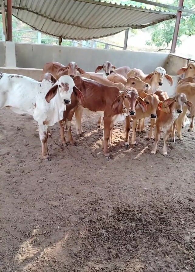 group of young cows standing under a corrugated metal roof supported by metal beams. The cows are various shades of brown, with one being white with brown spots. They stand in a dirt-covered enclosure partially surrounded by metal fencing. Trees are visible in the background. One cow moves forward slightly. The scene appears to be on a farm or animal shelter. The lighting indicates daytime.
