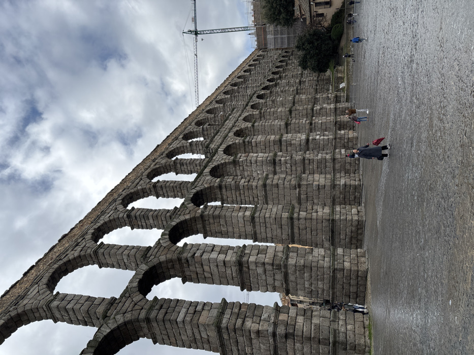 - "An outdoor, eye-level photograph captures a segment of the ancient Roman Aqueduct of Segovia in the Plaza del Azoguejo, Segovia, Spain, under an overcast sky" by FM-Uh5pH2, licensed under CC BY 4.0