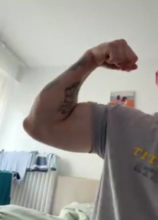 A bald man with a mustache flexes his bicep. He is wearing a gray t-shirt with yellow lettering. He has a tattoo on his arm. He is in a bedroom. The bed is to the left. A framed picture is visible on the wall in the background.