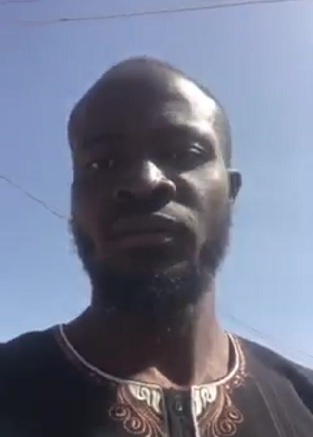 A man with dark skin, a closely shaved head, and a short beard looks into the camera against a clear blue sky. He is wearing a dark shirt with light-colored decorative patterns around the neckline. He makes a slight lip movement and widens his eyes briefly. The environment appears to be outdoors.