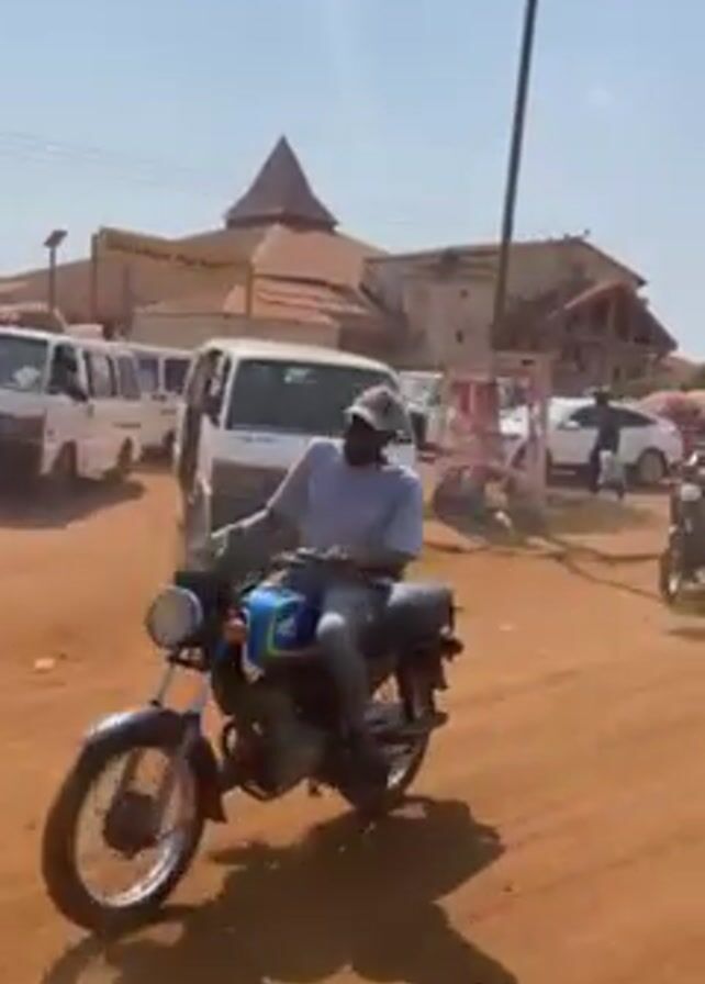 dirt road in a populated area. A black dump truck drives to the left of the camera. A motorcycle with two people on it passes by. Then a white Toyota Hilux pickup truck with police lights drives past. The background shows a building with a pointed roof, along with people, parked cars, and motorcycles.