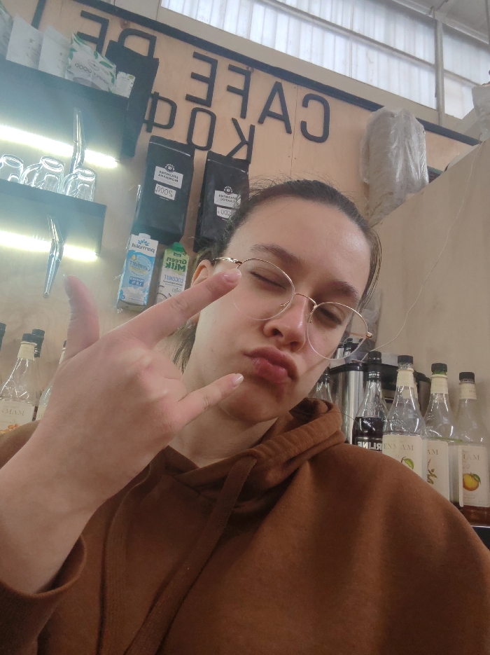 A woman with glasses poses, making the rock on hand gesture. She wears a brown hoodie. In the background are shelves filled with coffee paraphernalia, including glasses, coffee bean bags, cartons of coconut milk, and flavored syrup bottles. Behind the shelves, the words "CAFE KOP" are visible, oriented upside down. The scene suggests a casual cafe setting.