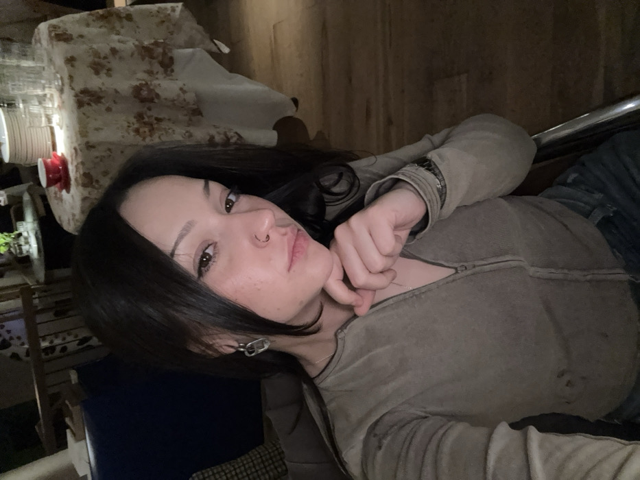 A young woman with dark hair and a nose ring poses. Her right hand is held up near her face. She wears a zip-up, long-sleeved top, jeans, and silver earrings. A table with a floral tablecloth and various objects sits in the background. The photo is rotated slightly clockwise. The lighting is dim.