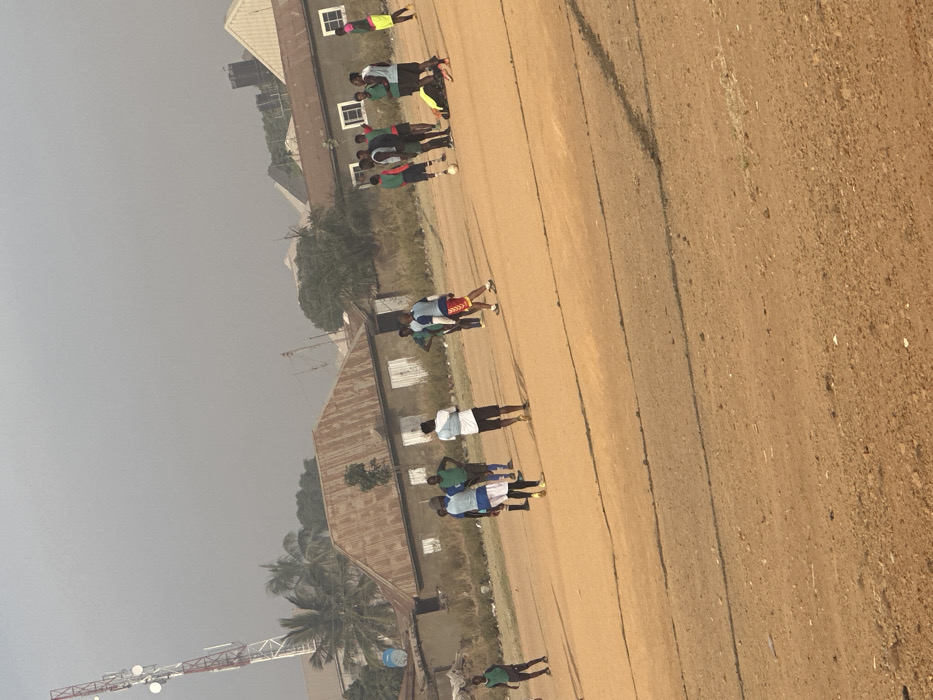 A dirt field stretches horizontally, with a group of individuals dressed in athletic gear. Some are gathered near a soccer ball, while others are spread out along the field. Buildings with metal roofs and a communications tower stand to the side. The sky is hazy, suggesting either dust or fog in the air. The scene appears to be a casual athletic practice or informal game outdoors.