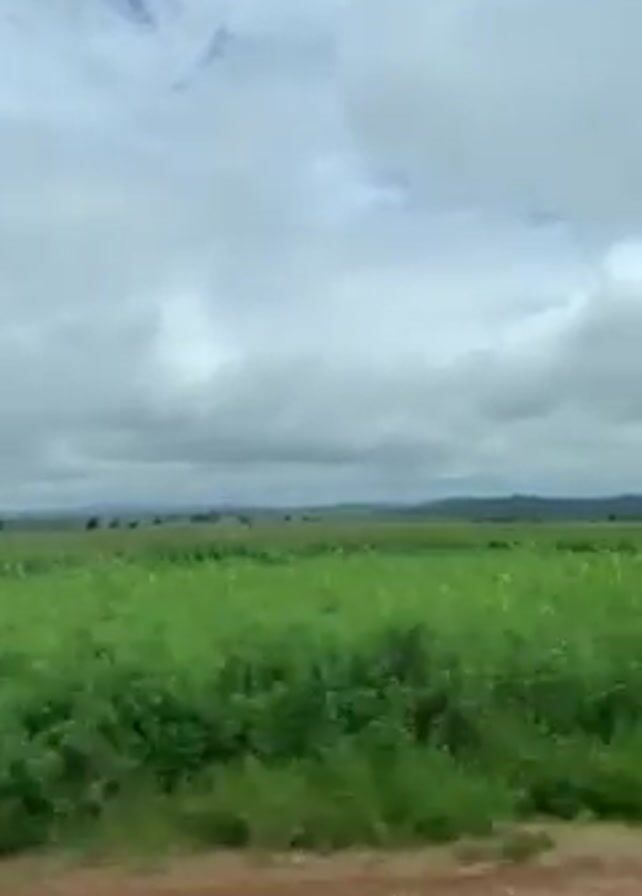 landscape of a green field under a cloudy sky. The field stretches out to the horizon, where some hills or mountains are visible in the distance. A dirt road runs along the edge of the field, and the camera appears to be moving along the road.