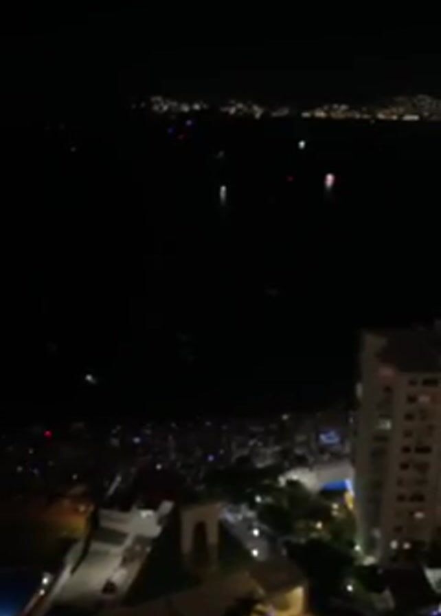nighttime scene with a large crowd gathered on a beach or near a body of water. Several lights are visible in the water and on the horizon, suggesting boats or city lights in the distance. The crowd appears to be dense, with numerous small points of light, possibly from phones or handheld lights. A tall building with illuminated windows is visible on the right side of the frame, suggesting that the video is being recorded from an elevated position within a hotel or similar structure. The lighting is dim, with the primary sources of illumination coming from the crowd and distant lights.