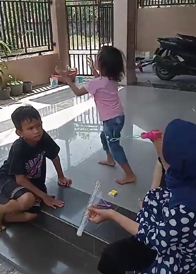 The scene features three individuals in an outdoor setting. A young boy sits cross-legged on a tiled step, wearing a black t-shirt and shorts. A little girl, dressed in a pink shirt and denim shorts, stands nearby, initially reaching her arms up before attempting to catch bubbles. A woman wearing a blue hijab and a navy polka-dot blouse sits on the steps, using a pink bubble wand to blow bubbles. Behind them is a tiled patio area enclosed by a black metal fence. Several potted plants sit near the fence. A black motorcycle is parked in the background. Sunlight illuminates the scene, casting shadows on the tiles. The setting appears to be the porch or patio of a house, with a clear, sunny sky visible above.