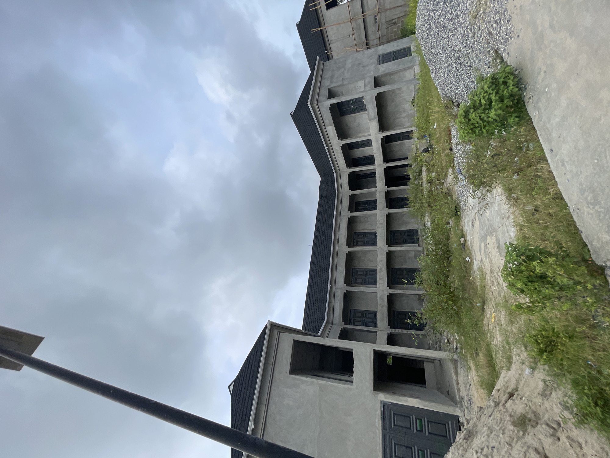 The image depicts a building under construction in Badagry, Nigeria. The structure is made of concrete and has multiple floors with open window frames and black doors. The exterior is unfinished. Construction materials, including piles of rocks and dirt, surround the building. Vegetation grows around the base of the building and along a concrete walkway. The sky is overcast with heavy clouds. A black pole is visible in the foreground. No people are visible.