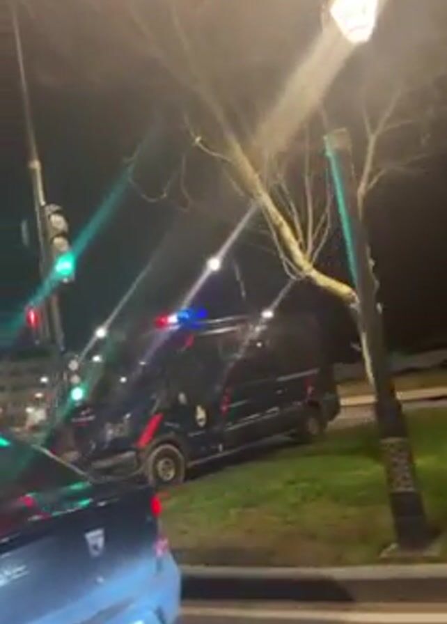 dark, nighttime street scene. A gray car, with license plate visible, is in the foreground. To the side of the car is a black van with red accents parked on a patch of grass next to the road. The van has a light bar on top. Street lights illuminate the scene. A traffic light cycles through green and red signals. The background includes sparse trees and other streetlights lining the road.