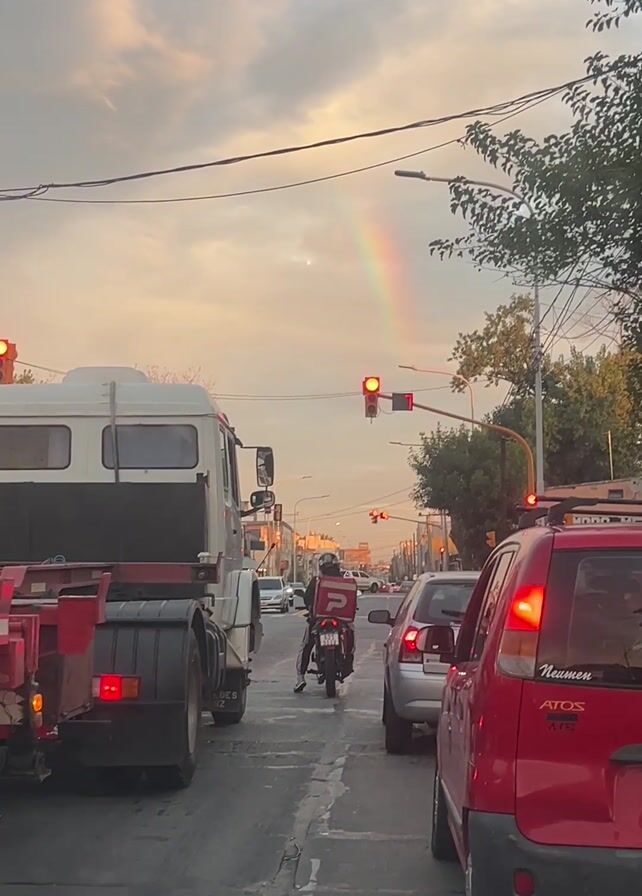 street scene from inside a car, with a rainbow visible in the distance. The sky is cloudy with a pastel color and a sliver of the moon can be seen above the rainbow. In front of the car are other vehicles stopped at a red traffic light, including a large white truck, a silver sedan, and a red hatchback. A motorcyclist wearing a black helmet and a red delivery backpack is positioned between the truck and the silver sedan. The traffic light has a digital countdown showing the remaining seconds before it turns green. Streetlights and overhead wires are also visible.