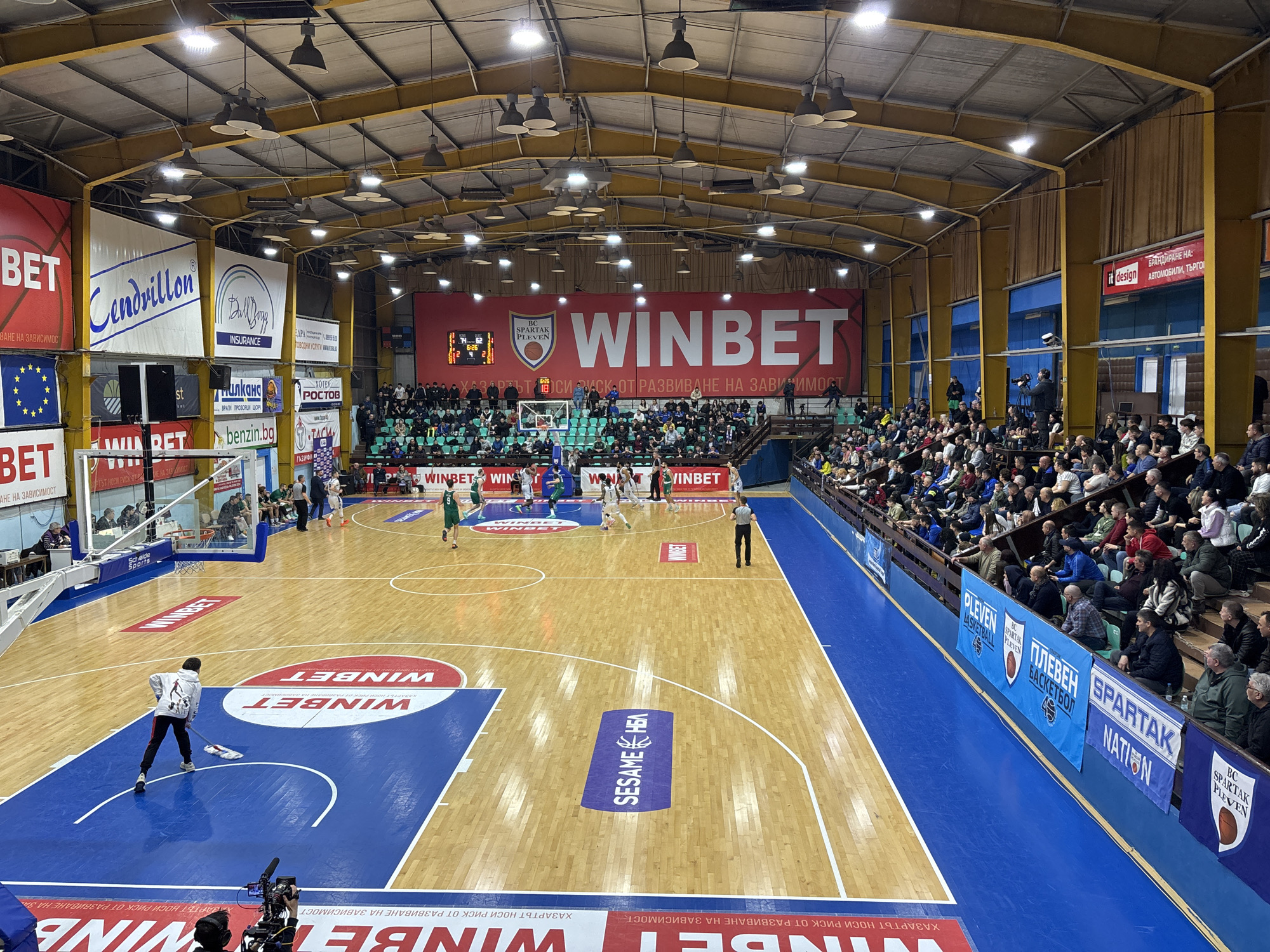 An indoor basketball game is in progress at Sports Hall Spartak in Pleven, Bulgaria. The scene is viewed from an elevated position, looking down onto a wooden court with standard basketball markings, including blue painted areas at the free-throw lines and baselines. Prominent "WINBET" logos are visible on the court and a "SESAME HBM" logo at mid-court. Multiple basketball players, some in green uniforms and others in white, are distributed across the court, indicating active play. A referee in a black and white striped shirt stands near the center of the court. One individual in a white hoodie and black pants is actively mopping a section of the blue-painted area near the closest baseline. A camera operator with professional video equipment is positioned on the floor near this same baseline, facing the court. Tiered spectator seating, predominantly occupied by adults, lines both sides of the court. The stands feature green and blue plastic seats. Directly above the far basket, a large red banner displays "WINBET" and "BC SPARTAK PLEVEN" alongside an electronic scoreboard showing scores of "74" and "62" with a timer indicating "6:26." The hall's ceiling features exposed yellow metal girders supporting a grey roof structure, equipped with numerous industrial-style lighting fixtures. The walls above the seating areas are covered with various sponsor banners, including "Cendrillon," "Bull Dogg INSURANCE," "benzin.bg," "ДOСТОЙ" (DOSTOY), "АЛПИНА" (Alpina), and "YOYO ROSTOV," alongside banners featuring the European Union flag and "BC SPARTAK PLEVEN" branding. Wooden paneling is visible on the upper portions of the walls on the right side of the image.
