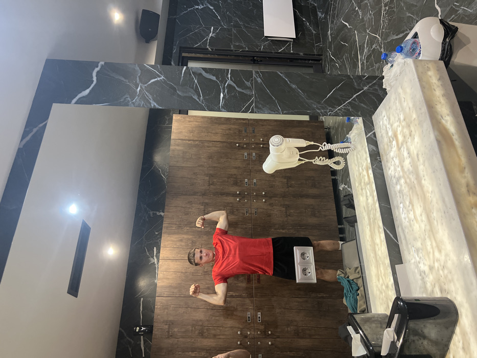 The image captures the interior of a modern locker room or changing facility in Botevgrad, Bulgaria, observed through a large mirror. A young adult male, reflected centrally, wears a red short-sleeved t-shirt and black shorts, posing by flexing both biceps and looking towards his reflection/the camera. Behind him, a long bank of waist-height, dark wooden lockers with numerous metal handles spans the background. A white, wall-mounted hairdryer with coiled cords hangs to the right of the male subject. A double electrical outlet with silver frames is visible on the wall, reflected at the subject's waist level. The surrounding environment features dark, marble-patterned walls with prominent white veining on the right side and floor, contrasting with a light-colored, possibly marble or stone, countertop in the foreground. On the countertop's left, two black tissue dispensers are present, with a crumpled green textile (likely a towel or clothing item) situated beneath the male subject's reflection. To the far right of the countertop, two plastic water bottles are contained within a white holder. Overhead, a white ceiling features recessed lighting. A black speaker is mounted on the far right wall. A partial reflection of another individual's arm/shoulder is visible on the far left edge of the mirror.