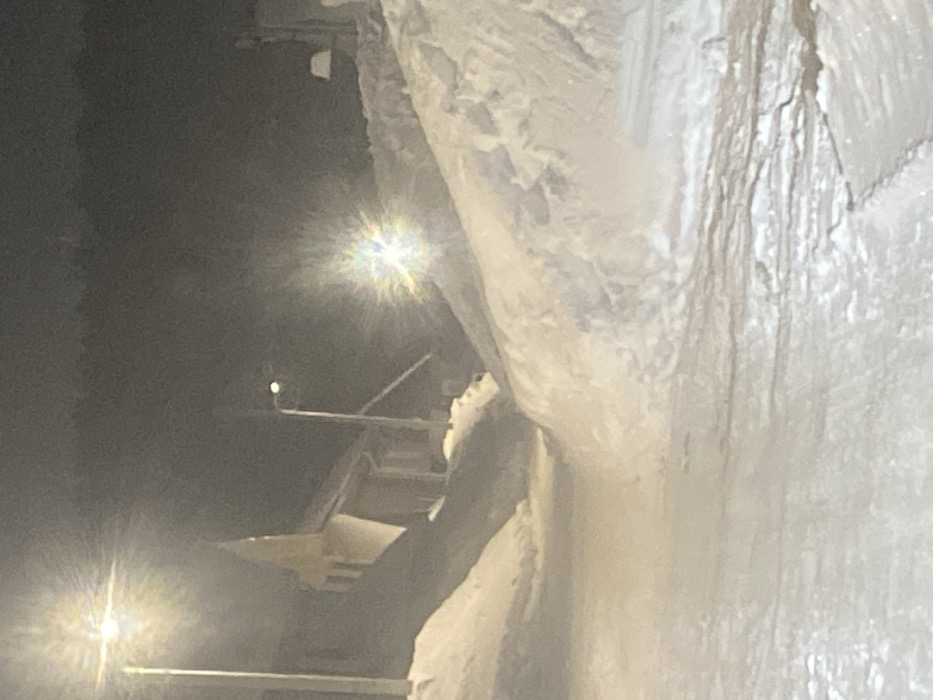 The image depicts a dimly lit outdoor stairway adjacent to a rough, textured wall. Lights shine brightly at the top and bottom of the steps, casting a starlike effect. The stairs ascend at an angle, appearing narrow. The wall’s surface is light in color with vertical striations, suggesting possible water flow or natural weathering. The environment is mostly dark, with the lights providing the main source of illumination.