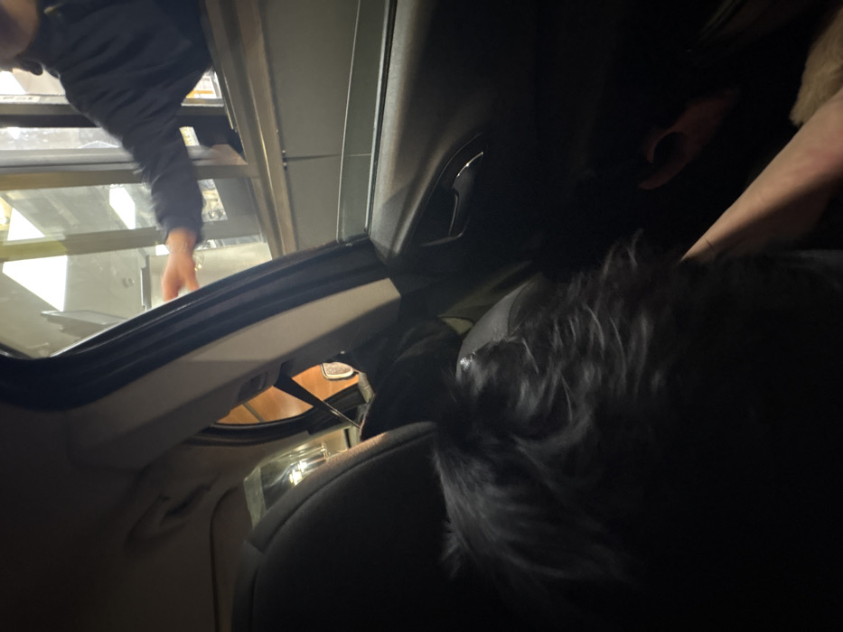 Inside a car at a drive-through, a person reaches toward a window to receive an item. Another person sits in the passenger seat. The scene is darkly lit, but light shines from outside, illuminating the interaction at the window. The car interior is visible, including the dashboard, seats, and headrest.