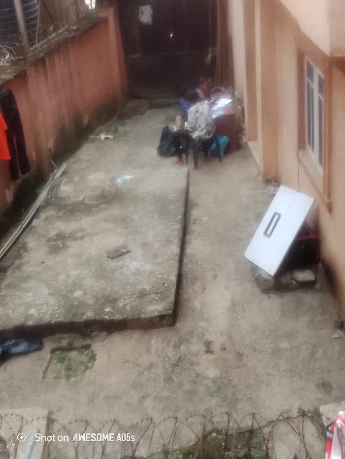 The image displays an outdoor alleyway or courtyard located in Awka, Nigeria, under dim, likely artificial illumination, suggesting dusk or night