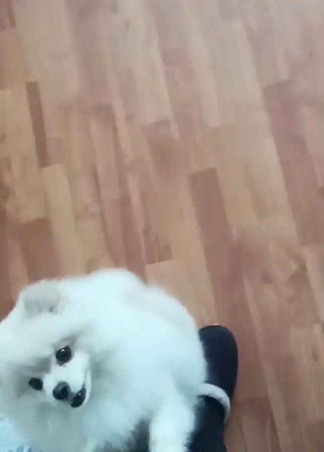 A short video shows a small, white dog standing on someone's foot
