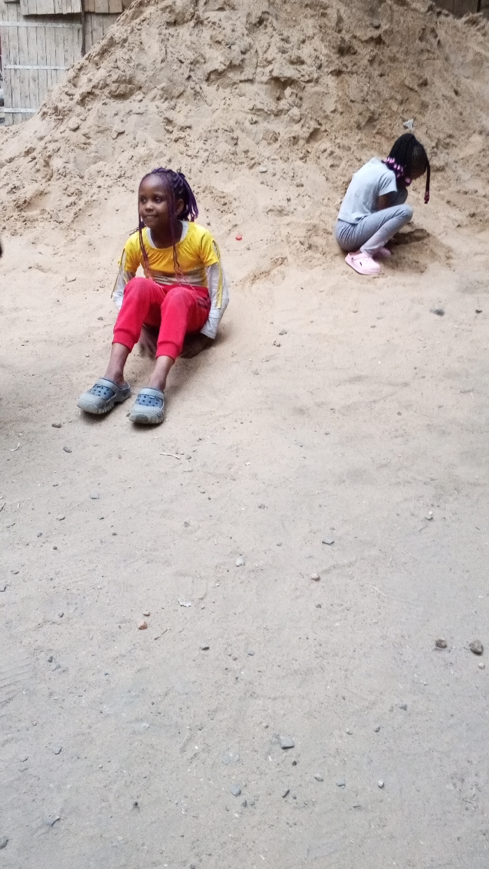 The image depicts two young girls interacting with a large pile of light brown sand in an outdoor, dusty environment within Nairobi, Kenya