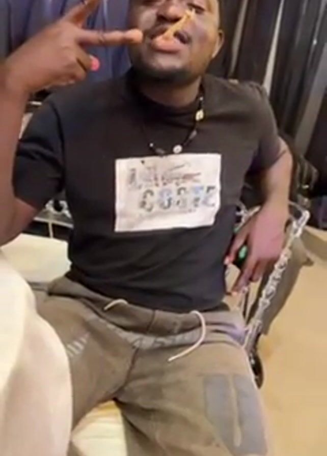 A man sits in a chair, smiling at the camera and giving a peace sign with one hand. He has a piece of food in his mouth. He is wearing a black t-shirt with “LACOSTE” printed on it, and knee-length shorts. He also wears a beaded necklace. Behind him are dark curtains. There is a table to the left.